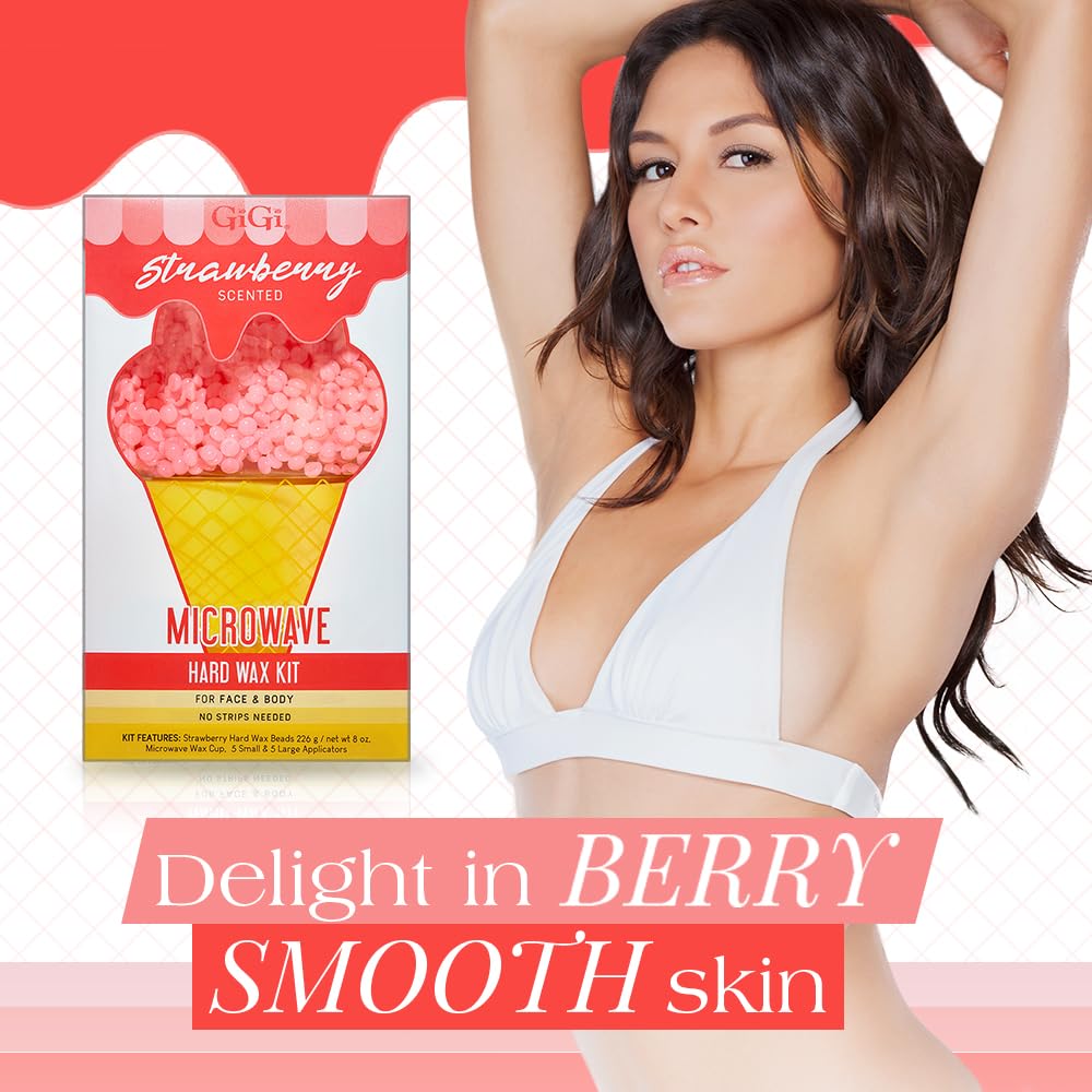 GiGi Strawberry Microwave Hard Wax Beads for Hair Removal - Scented Waxing Beads for Face & Body, Brazilian Bikini with Applicators & Microwave Wax Cup, 8 ox